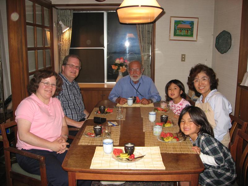 A group picture (taken by Etsuko) after dinner. Mitsuo and Noriko were Jane's first homestay family in Japan, and having dinner in their house was like coming home for her.