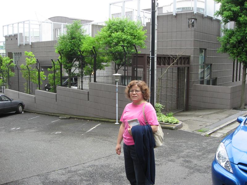 Jane is standing in the Stuart Plaza parking lot, with a building behind her. That building is on the location where Jane lived during her year in Yokohama; that is, the duplex in which she lived has been torn down and replaced with the building that you see behind her.