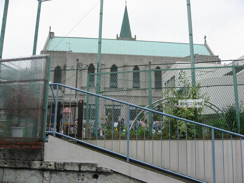 Along Stuart Plaza and off of Yamate-cho runs a small side street that ends in a cul-de-sac. The left part of the cul-de-sac has houses; the right part of the cul-de-sac abuts a Roman Catholic Church's playground.